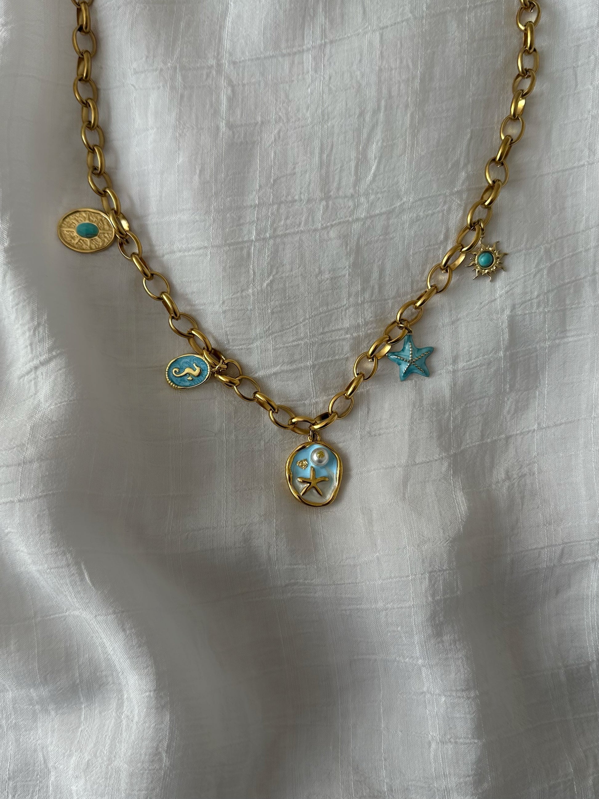Plongez dans un univers marin avec notre collier “La Mer”, une pièce raffinée en acier inoxydable doré ornée de charmants pendentifs inspirés de l’océan. Étoile de mer, hippocampe, soleil et autres symboles nautiques se mêlent à des touches d’émail bleu pour une allure envoûtante et estivale.
